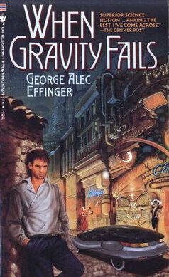 Tengo la impresión de que George Alec Effinger le debe más a Dashiell Hammett y a Jim Thompson por Cuando falla la gravedad que a autores ciberpunk como Bruce Sterling o William Gibson por poner dos ejemplos. Empecemos por el escenario que se aleja de la habitual estética ciberpunk —todos tenemos en mente Blade Runner—, una babel futurista con calles transitadas por un hervidero de gente sobre la que refulgen anuncios gigantes y en la que se alzan edificios enormes de apariencia vanguardista, sedes de poderosísimas multinacionales. En una trama ciberpunk es muy posible que nos topemos con hackers, inteligencias artificiales o que nos sumerjamos en el ciberespacio, nada de esto hallaremos en la novela de Effinger. Su adscripción al ciberpunk se debe a dos dispositivos tecnológicos presentes en la novela que permiten a quien se los conecta alterar la mente. Pero más que nada es novela negra. Una etiqueta que nos evoca de inmediato crímenes, personajes marginales, ambientes decadentes, corrupción policial, alcohol y protagonistas de moral cuestionable, elementos todos ellos presentes en el libro. Es importante recalcar la gran influencia que el género negro tuvo en el ciberpunk. No sólo comparten un mismo interés por personajes marginales sino que utilizan técnicas literarias similares: frases cortas, descripciones a machetazos, mucha acción y un narrador en primera persona.